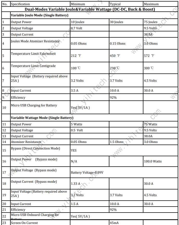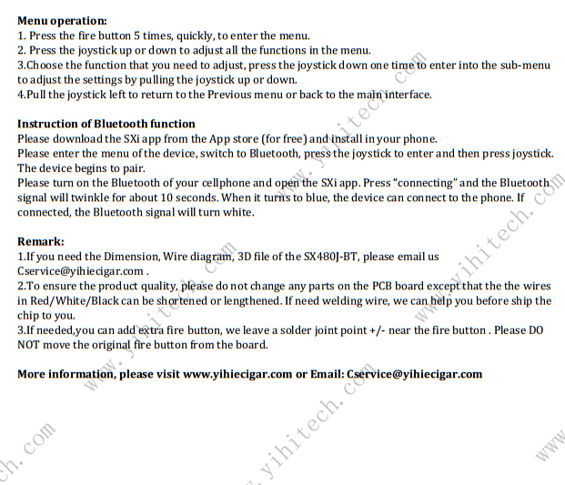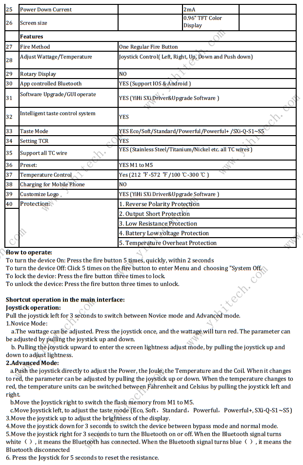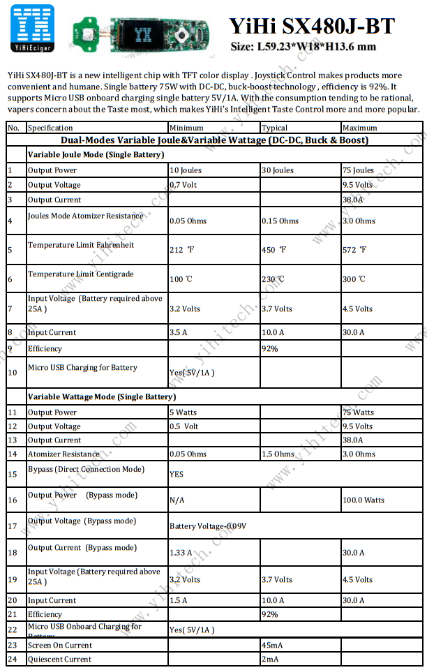 YiHi SX480J-BT is a new intelligent chip with ips TFT color display . Joystick Control makes products more convenient and humane. Single battery 75W with DC-DC, buck-boost technology , efficiency is 92%. It supports Micro USB onboard charging single battery 5V/1A. With the consumption tending to be rational, vapers concern about the Taste most, which makes YiHi’s Intelligent Taste Control more and more popular.