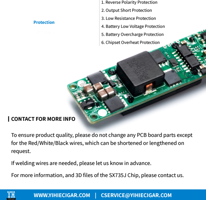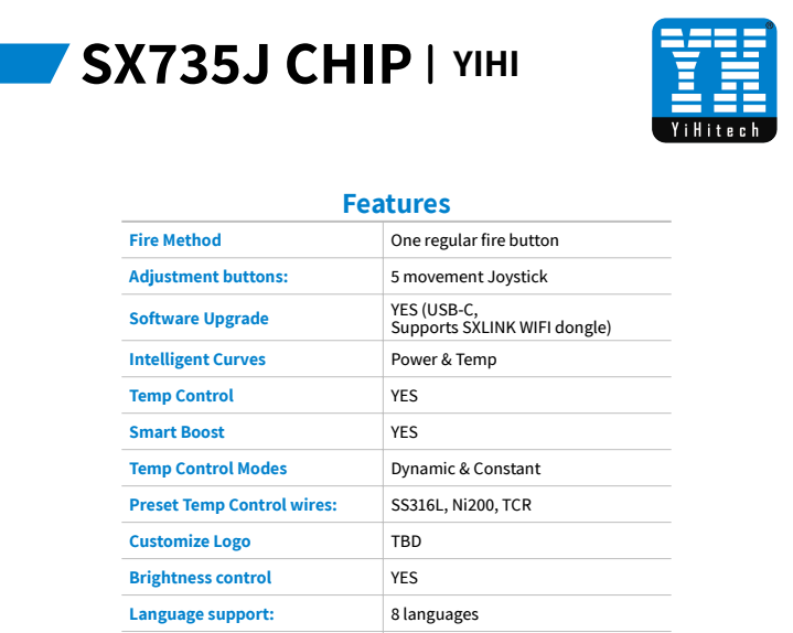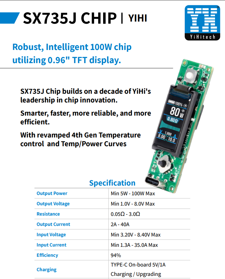 The SX735J Chip builds on a decade of YiHi's leadership in chip innovation, offering a robust and intelligent solution for electronic cigarettes and vaping devices. Powered by PURE technology with NENV (No E-Liquid No Vape), this chip delivers pure flavor, prevents dry hits, and ensures maximum protection. Ideal for single or dual battery setups, it supports advanced features like Smart Curves, Smart Boost, and multi-language support for a customizable and safe vaping experience.
